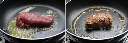 平底锅中放入20克黄油加热至融化,放入腌好的猪里脊肉,煎至表面金黄色
