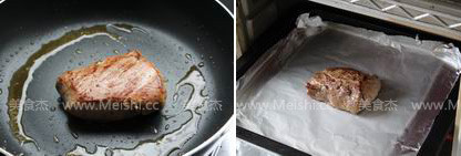 家里没有烤箱的朋友,可将猪里脊肉切厚片腌制再入锅煎熟,最后淋入酱汁味道也会很不错的;