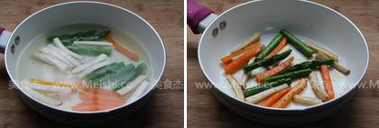 锅中倒入足量清水烧开,放入切好的胡萝卜、芦笋和杏鲍菇汆烫片刻后捞出