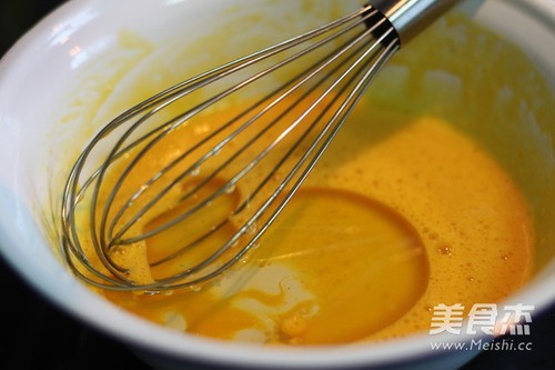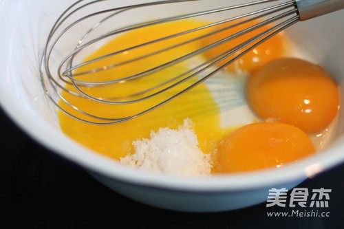 步骤1、将鸡蛋蛋白,蛋黄分离。蛋黄加入10g糖,打发至发白