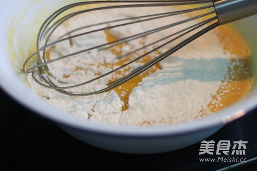 步骤3、加入水30克(或者牛奶40克),混合均匀。加入过筛的低粉,切拌均匀