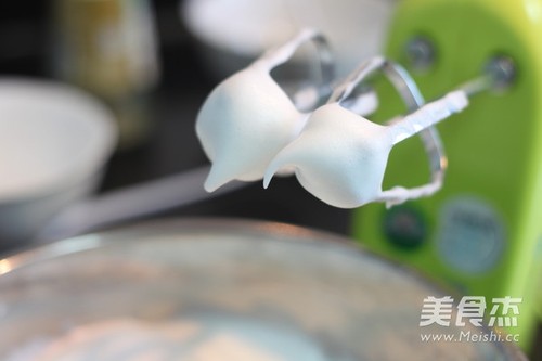 步骤4、将蛋白分三次加入30克糖,加入几滴白醋或者柠檬汁,打发至湿性发泡