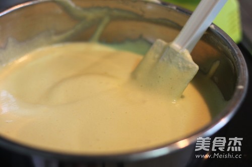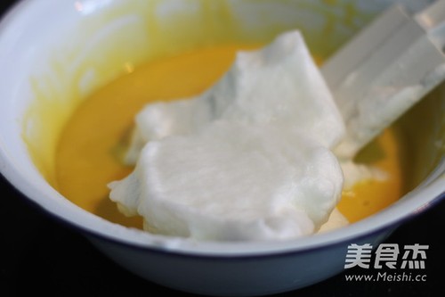 步骤5、取三分之一打发的蛋白加入混合好的蛋黄糊内,用刮刀切拌均匀