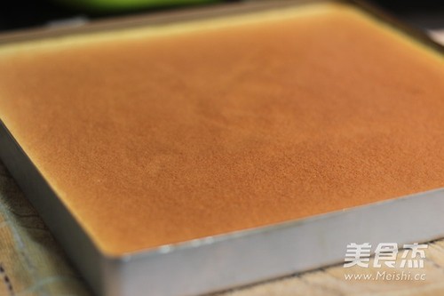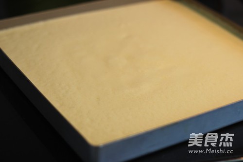 步骤7、将蛋糕糊慢慢倒入烤盘内,震出气泡