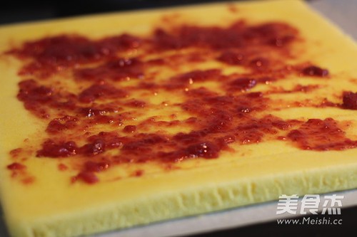 步骤10、用刀切出几条痕迹,抹上草莓酱