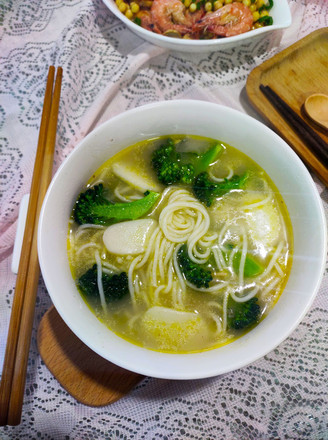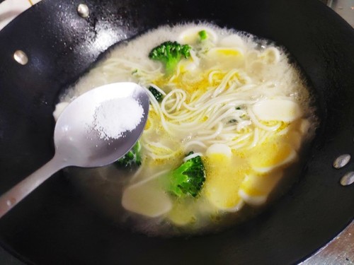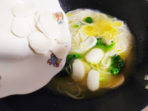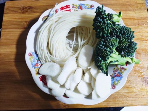 步骤7、下入西兰花和年糕,继续煮上3分钟。
