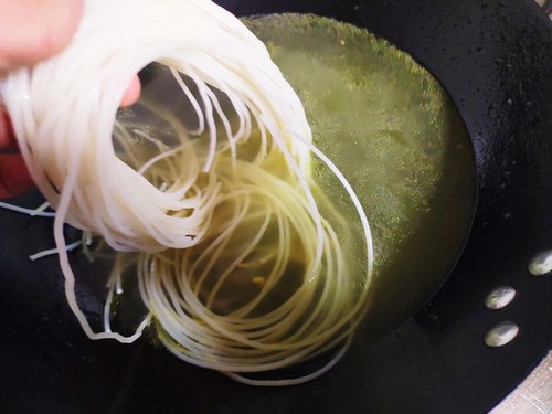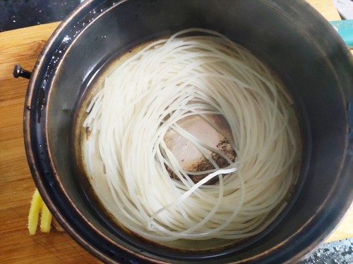 步骤6、下入泡软的米粉,再次煮开,转小火继续煮7-8分钟,米粉开始绵软。