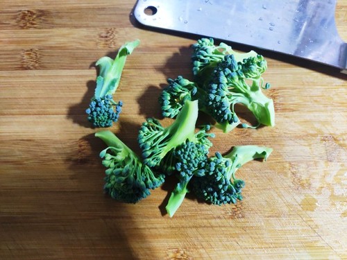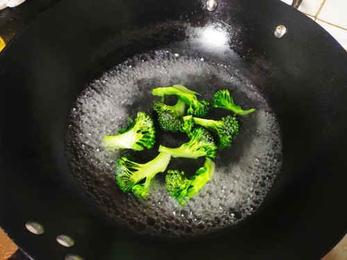 步骤4、锅中加入清水煮开,放入西兰花,汆烫30秒后捞出,冲洗一遍,待用。
