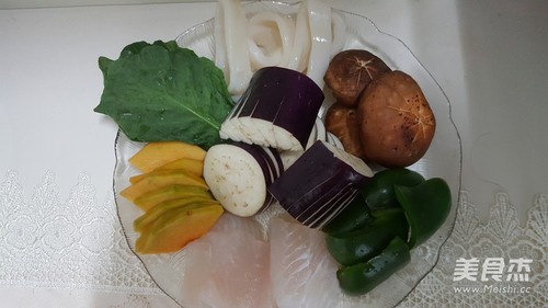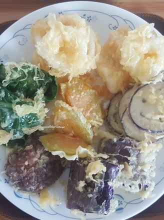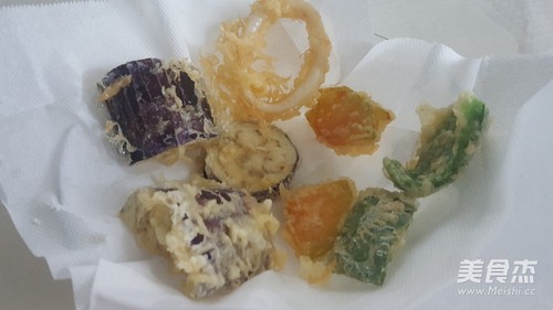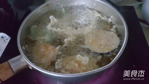 步骤4、开炸了 将准备的料,逐件放入油锅中。青椒,鱿鱼圈和鱼片都先沾生粉,然后放入粉浆中沾上粉浆后放入油锅中。其他不需要沾生粉。 中间用筷子翻面, 保证两面都被炸到。