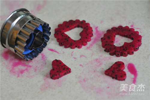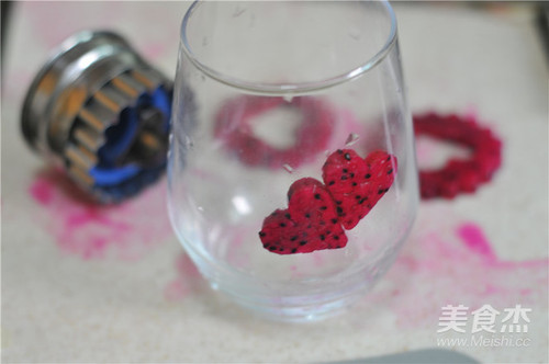 步骤3、用手辅助将心形的红心火龙果贴在杯子内壁,用手轻轻按压,将里面的空气挤出去