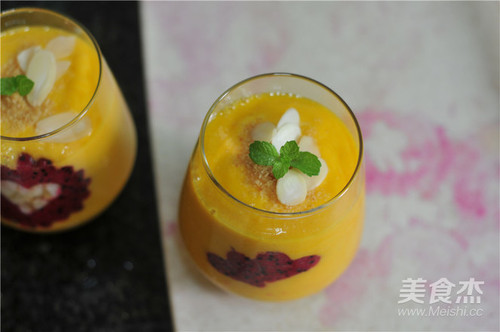 步骤5、将做好的果泥倒入装饰好的杯子里,放入冰箱冷藏半个小时