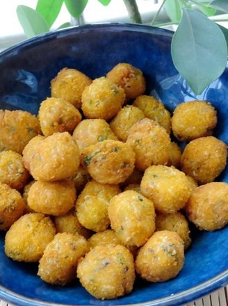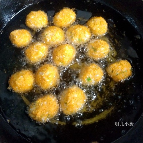 步骤6、油温五成热,放入丸子炸制周身焦黄,捞出控油。