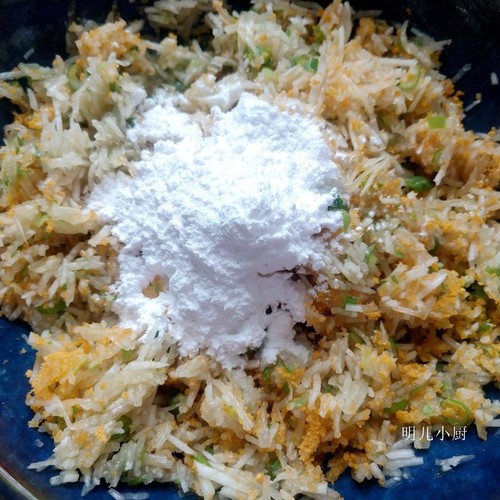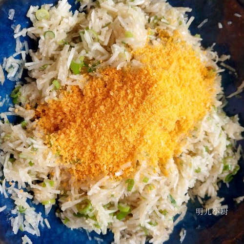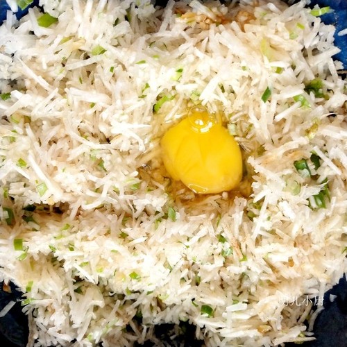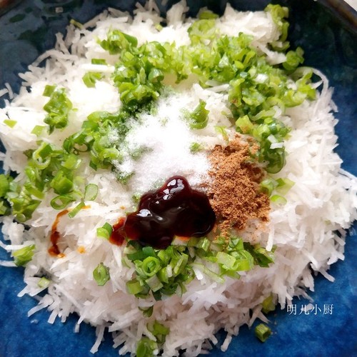 步骤1、首先把白萝卜用擦丝器擦成细丝,再剁成萝卜碎,双手挤掉多余水份,放入盆中。加入葱花,盐,五香粉,蚝油搅拌均匀。