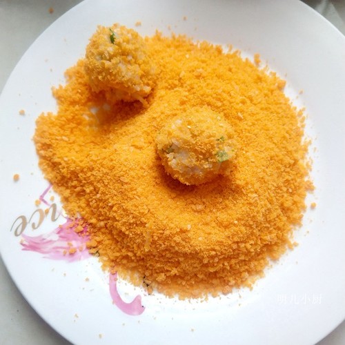 步骤5、手上抹上适量花生油,把萝卜糊捏成乒乓球大小的丸子,在裹上面包糠,再用手团一下,以防面包糠掉落。