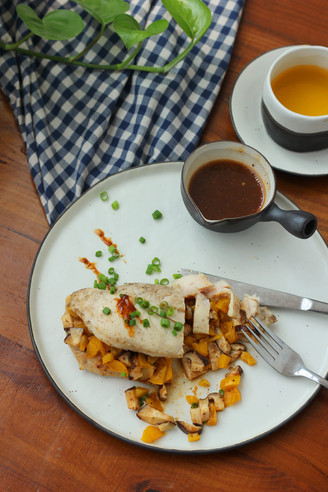 步骤13、取出蒸烤好的鸡胸,打开锡纸,将鸡胸移到盘子中,锡纸里面的汤汁倒入容器中,并加入一勺黑胡椒汁,调成黑胡椒料汁