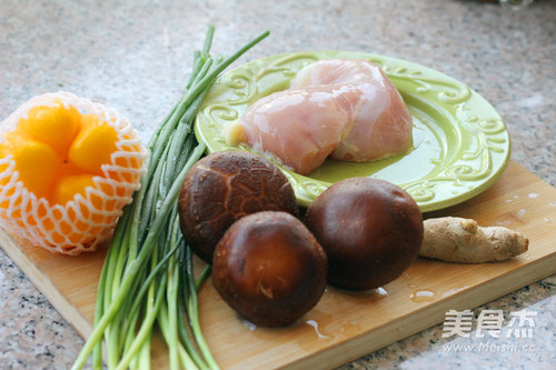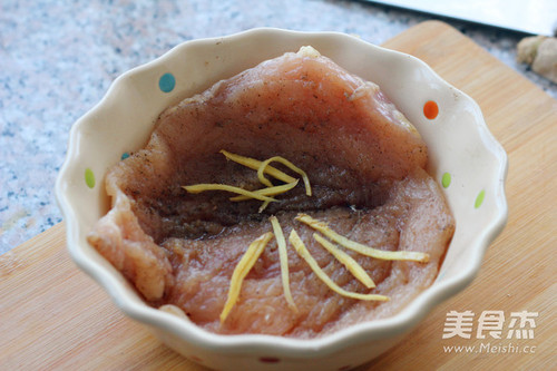 步骤4、稍稍按摩一下鸡胸,放入姜丝,用保鲜膜将碗覆盖,腌制半小时