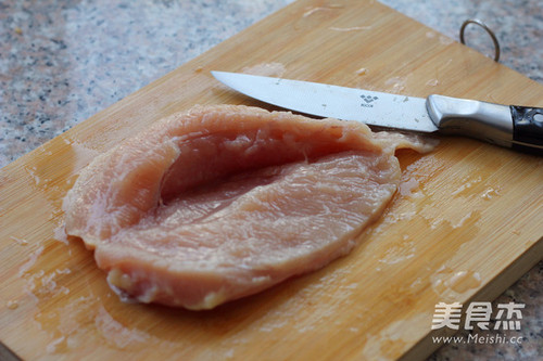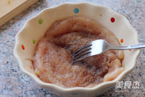 步骤9、把彩椒香菇丁包裹在鸡肉中