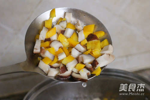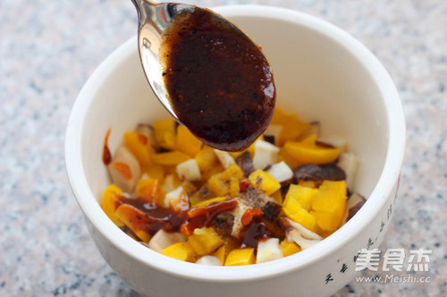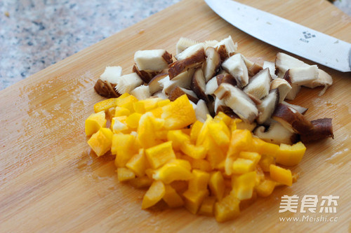 步骤7、焯好水的彩椒和香菇丁捞出来放在碗中,加入一勺黑胡椒酱搅拌均匀