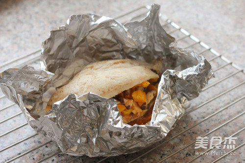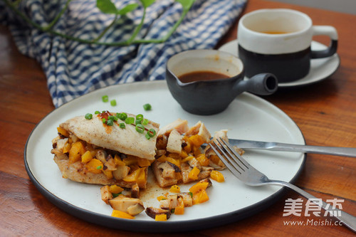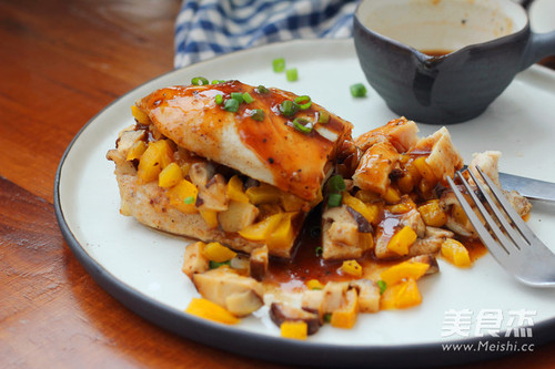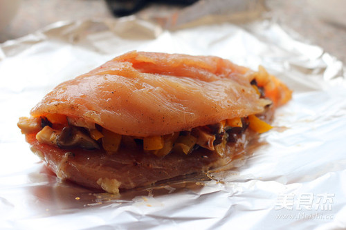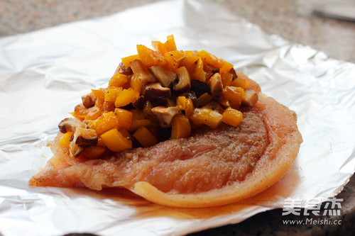 步骤8、取出腌制好的鸡胸,放在锡纸上,将调味好的彩椒香菇丁放到鸡胸上