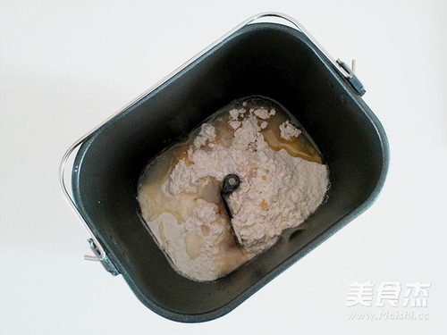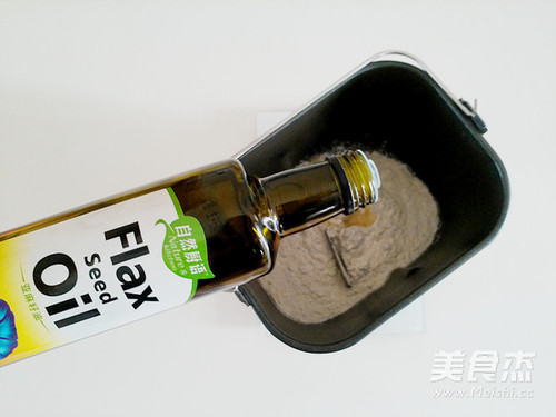 步骤1、将制作水油皮的材料粉类过筛后将中筋粉、低筋粉、亚麻籽油放入面包桶里。 (成品17个)