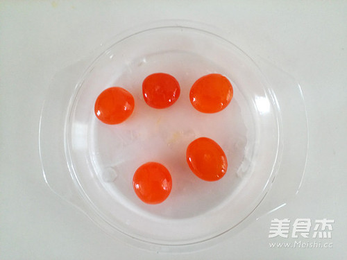 步骤5、新鲜的咸蛋黄取出后把表面的蛋白冲洗干净,用厨房纸吸取多余的水份后对半切开,晾一晾干表面,不用盖保鲜膜,我把蛋黄切开的原因是不想吃太多的蛋黄,依据个人喜好可以将蛋黄酥包入一整颗蛋黄。