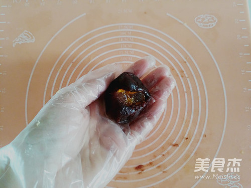 步骤7、揉好的豆沙馅放在手掌心里稍微压扁,中间放入半颗咸蛋黄,喜好吃一整颗咸蛋黄的就包入一颗咸蛋黄,用虎口收口包裹成圆球型,把所有的馅料做好备用。
