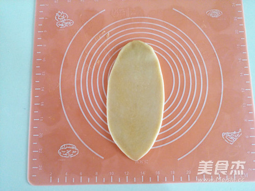 步骤12、用擀面杖擀成牛舌状约10CM长。