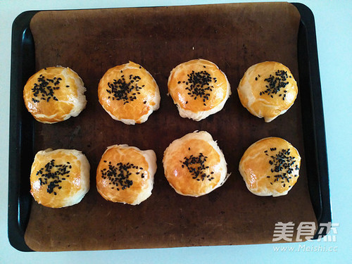 步骤21、表面刷上蛋黄液后洒上黑芝麻,放入预热好的烤箱200度中层烤10分钟,10分钟后把温度调到180度继续烤20分钟,如果烤的时候表面上色就可以盖上一张锡纸继续烤,烤好的蛋黄酥取出,5分钟后把蛋黄酥移到烤架上等待凉却。