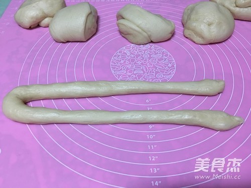 步骤9、将发酵好的面团取出平均分成六份,每份搓成约60cm的长条。