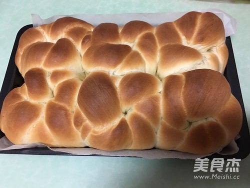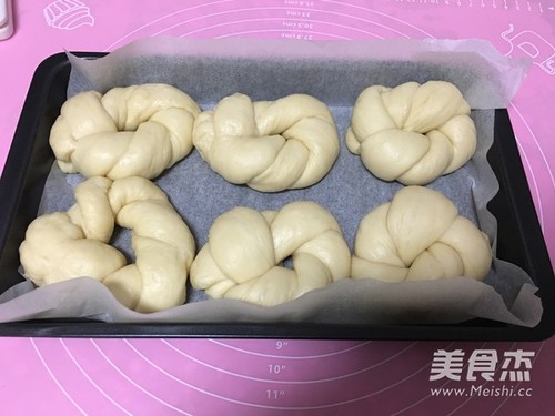 步骤12、整好放到铺了油纸的烤盘内,我的烤盘大小是放入烤箱进行发酵。发酵时在烤箱内放入一碗温水。