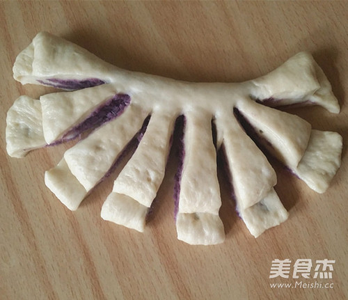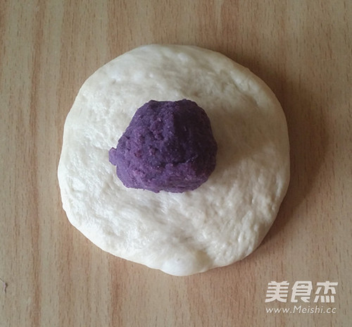 步骤9、取一面团压扁,放入紫薯,包圆