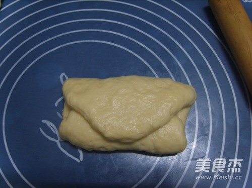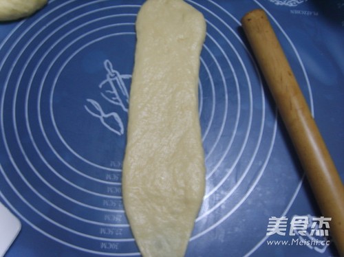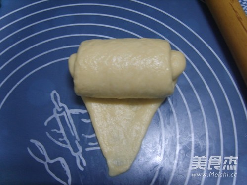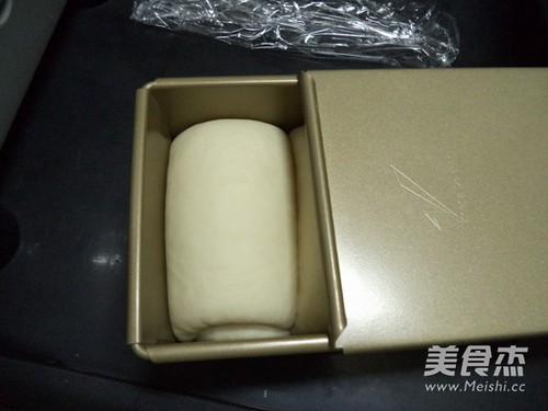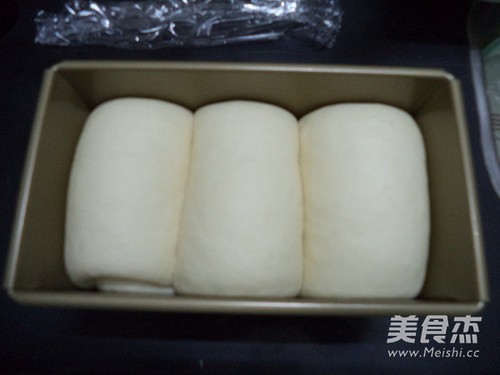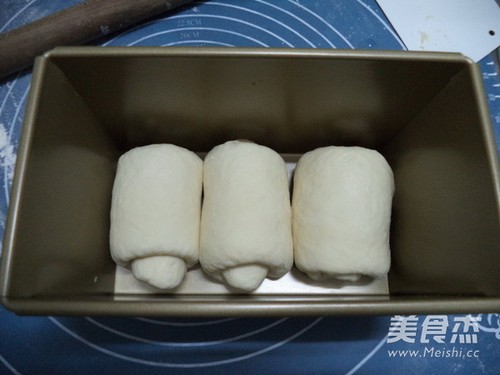 步骤13、依次卷好,放吐司盒里盖上保鲜膜放温暖处进行二次发酵