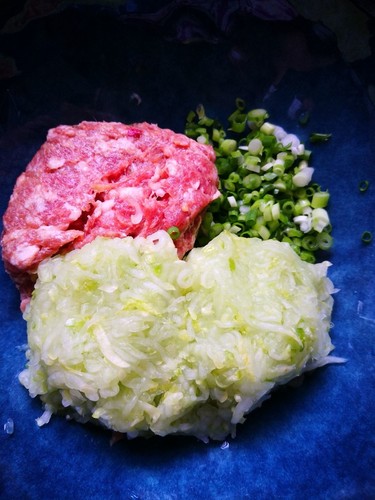 步骤6、猪肉馅中加入小葱花,老黄瓜去了水分。