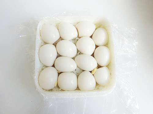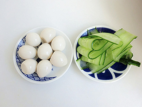 步骤1、鹌鹑蛋提前煮熟,剥去皮,这里鹌鹑蛋可以选用原味的生鹌鹑蛋,自己煮熟,也可以选用现成的鹌鹑蛋罐头,随用随取,省时省力还方便。黄瓜用工具刨成薄片的条状