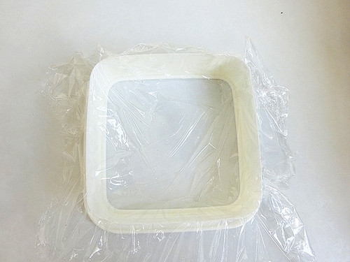 步骤3、我用了一个三明治的工具来做,可以用盆等自己使用顺手的器具都行。裁剪一大块保鲜膜铺在工具上