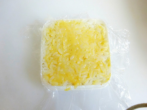 步骤5、鹌鹑蛋对半切开,倒扣在米饭上排排摆好