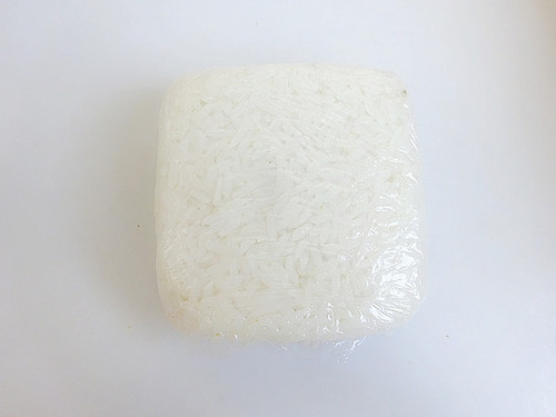 步骤4、盛米饭铺在底部,半厘米厚的样子,压实