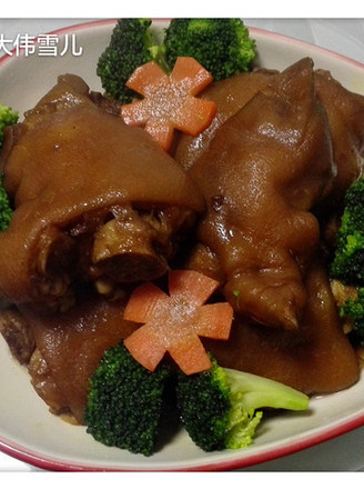 步骤12、装盘,配上绿菜花和胡萝卜花,软糯清香的酱烧猪蹄就做好了,热吃入口即化,冷凉了吃Q弹有嚼劲^^