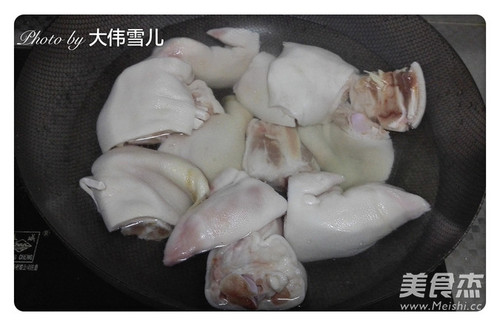 步骤3、炒锅放适量冷水,猪蹄放进去,烧开卯掉多余油脂。