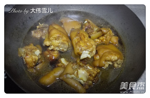 步骤6、猪蹄放油锅翻炒均匀,再倒入适量老抽,放点白砂糖,翻炒均匀,然后加入适量热水或温水,再加入两大勺六月香豆瓣酱,大火煮开。