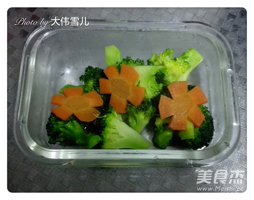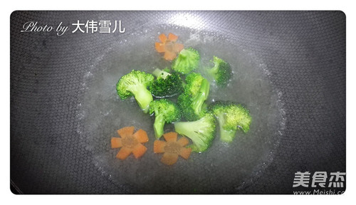 步骤9、趁高压锅工作的空,将三小朵绿菜花洗净切成更小的朵,胡萝卜切成萝卜花,然后入加了油和盐的开水中烫一下。
