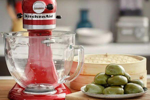 步骤19、 青汁面团:厨师机安装上搅拌桨,把熟澄面面团和糯米粉、白砂糖放入搅拌缸,开启功能键1档
