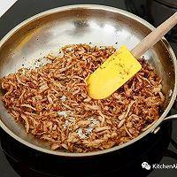 步骤3、 煎锅大火加热,加入植物油和肉丝,翻炒1分钟,炒出香味后,转小火,加入生抽和糖,继续翻炒约15分钟,将水份炒干