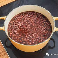 步骤11、 豆沙馅心:赤豆洗干净后和冷水一起下锅,火力调至大火,待水烧开后,加入食用碱粉,转小火,慢煮1个小时,至酥烂为止