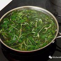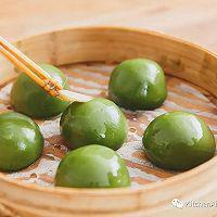 步骤15、 自制青汁:将清洗干净的艾草叶,放入加入小苏打的沸水中,汆烫5秒,捞出,沥干放凉