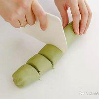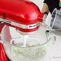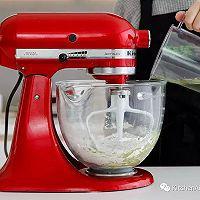 步骤20、 慢慢倒入混合青汁,搅拌约5分钟,至面团混合均匀,成为柔软的面团