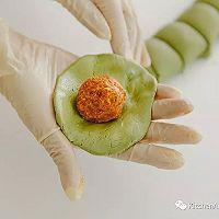 步骤22、 包青团:手心上抹少许油,将面团搓成圆形,然后压成扁圆,放入蛋黄肉松馅心或豆沙馅心