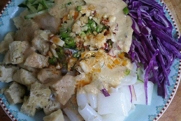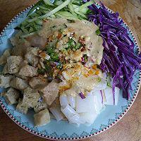 步骤9、 把凉皮切好,加入面筋,黄瓜丝(我还加了紫甘蓝),少量盐,生抽(我用的味达美)醋,蒜泥,芝麻酱,辣椒油拌匀即可。