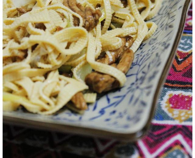 豆腐皮切丝,肉切丝,葱切丝。酱油水淀粉滚肉丝