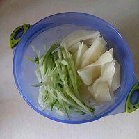 步骤8、 面皮切成条状,黄瓜洗净切成细丝。用调料拌匀就可以开吃了。